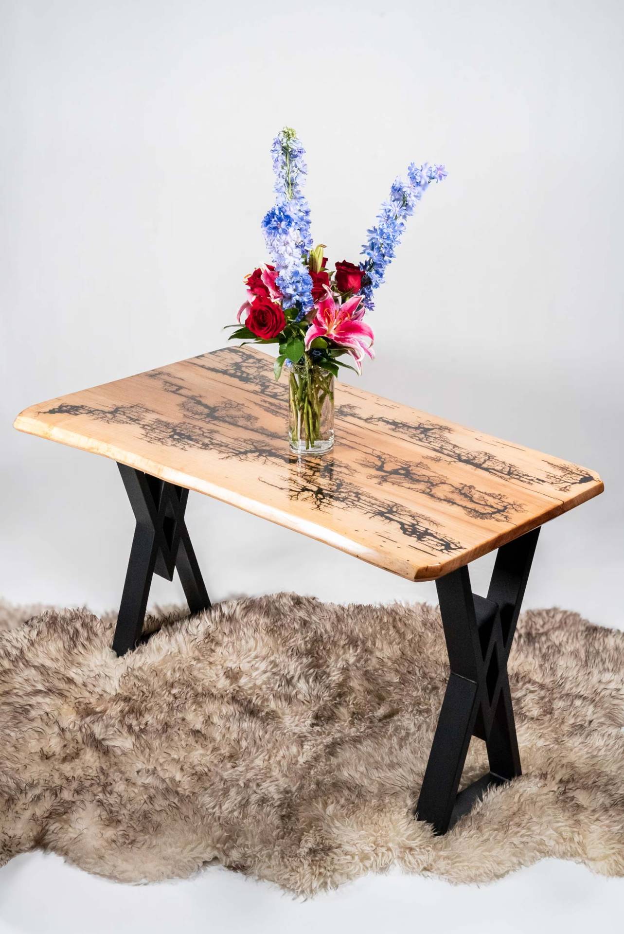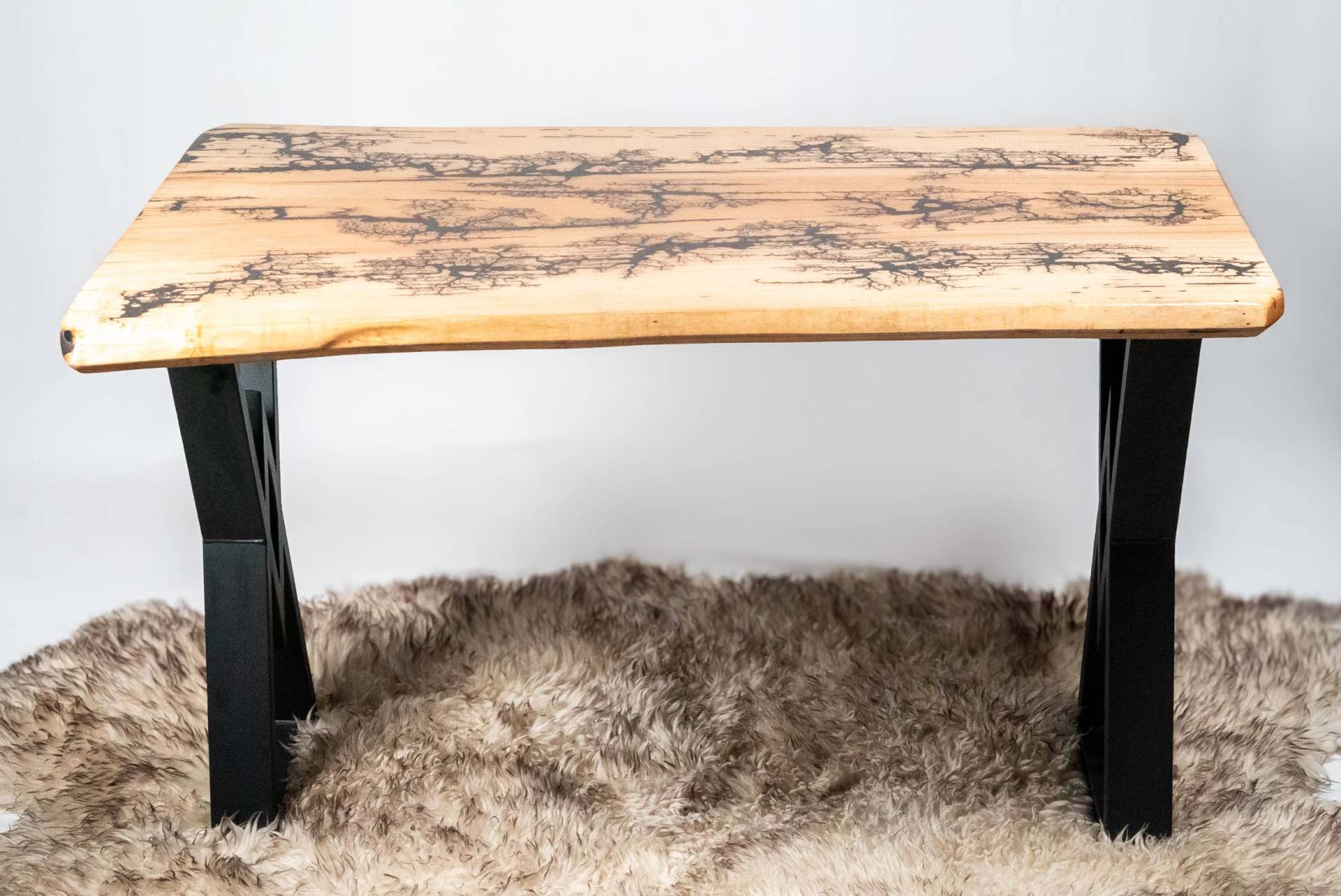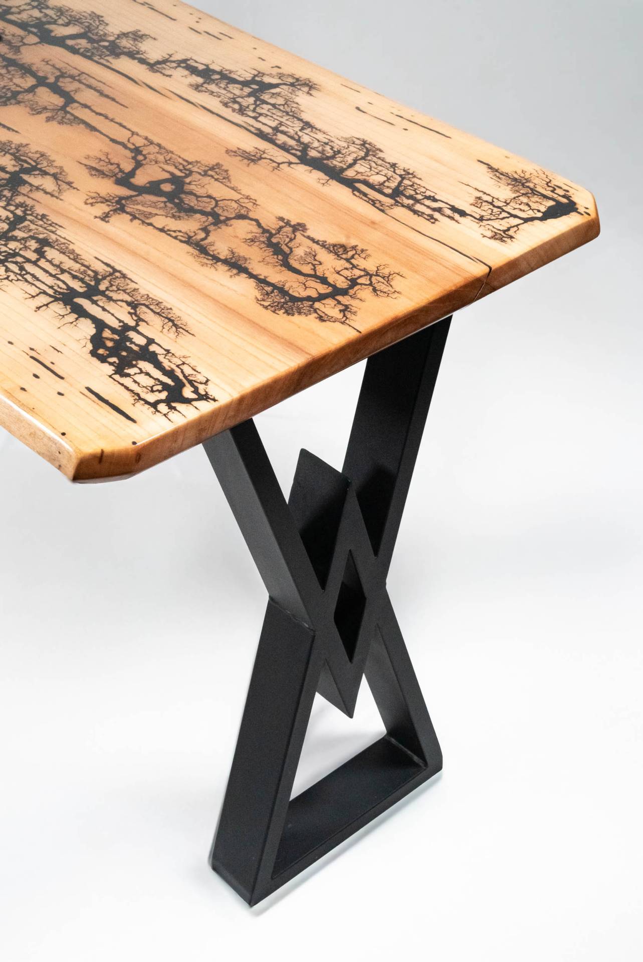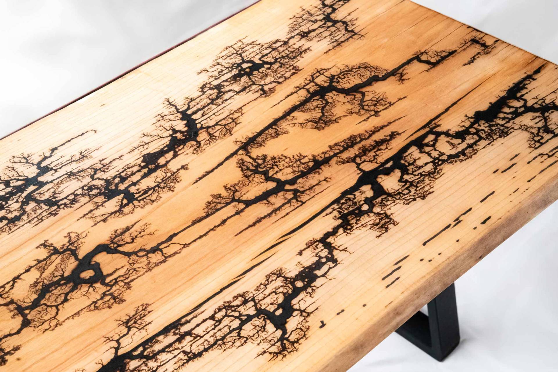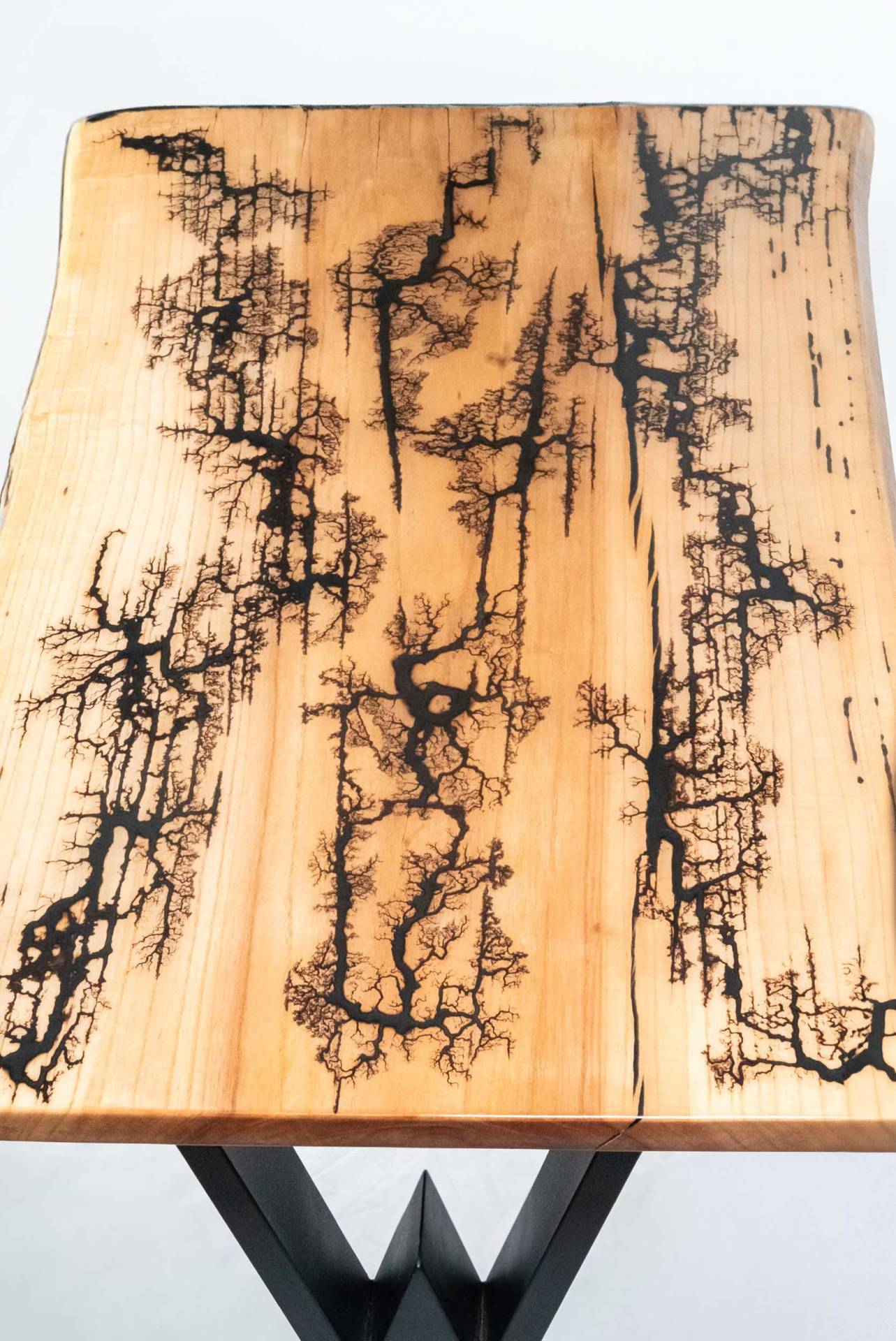 The splendid “Fractal Bombshell” practically exploded out of thin air, shocking the world with its beautiful tree-like electrical branches, filled with metallic epoxy. It eloquently plays into the soft wood grain from Ash wood slab.